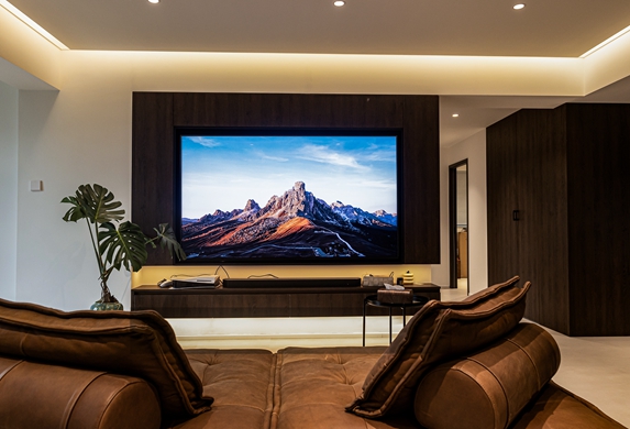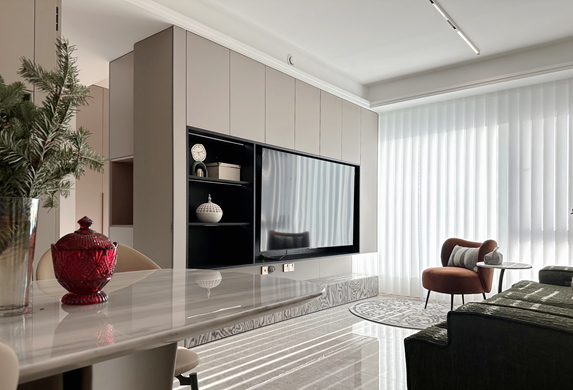 京西印玥129平米現代簡約風格的裝修案例,客廳采用無主燈設計,以簡潔線條和中性色調營造出寧靜舒適的空間氛圍。智能電動夢幻簾的運用為客廳增添浪漫氣息與光影一角。電視背景墻設有隱